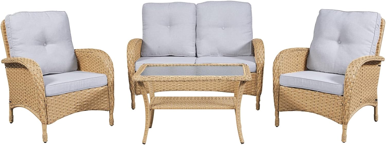 HUMMUH 4-Piece Patio Furniture Wicker Outdoor Conversation Set,All-Weather Rattan Outdoor Bistro Set with Loveseat Chairs Coffee Table for Backyard,Poolside,Deck